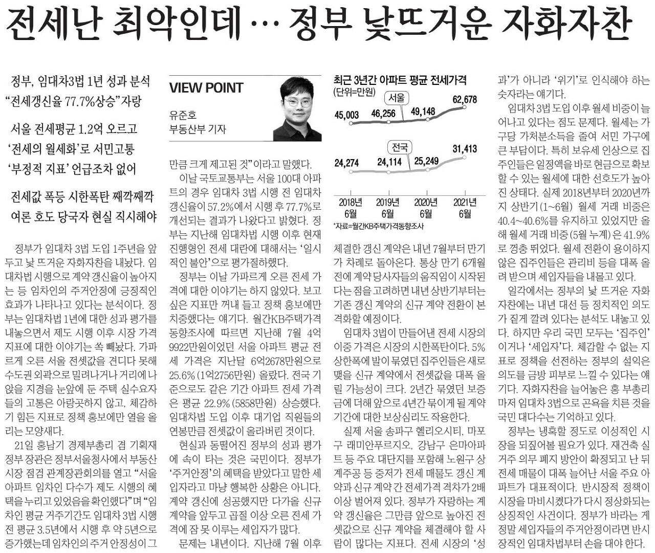 정부는 임대차 3법을 통해 임차인을 보호하고 주거안정에 대한 큰 성과를 이루고 있다고 본다. 하지만, 실상은 그렇지 않다고 생각한다. 임대차 3법은 임차인을 보호하기 위해 만든 법으로써 임대인 입장에서는 피해를 보는 부분이 있다고 생각한다. 그렇기에 임대인은 자신들의 피해를 임차인에게 전가시킴으로써 오히려 약보다는 독으로 바뀌고 있는 상황인 것 같다. 이로 인해 법을 개정하게 된다면, 한 쪽으로 치우친 법이 아닌 서로 대등할 수 있는 법을 개정하여야 윈윈이 아닐까라는 생각이 든다.